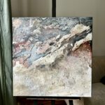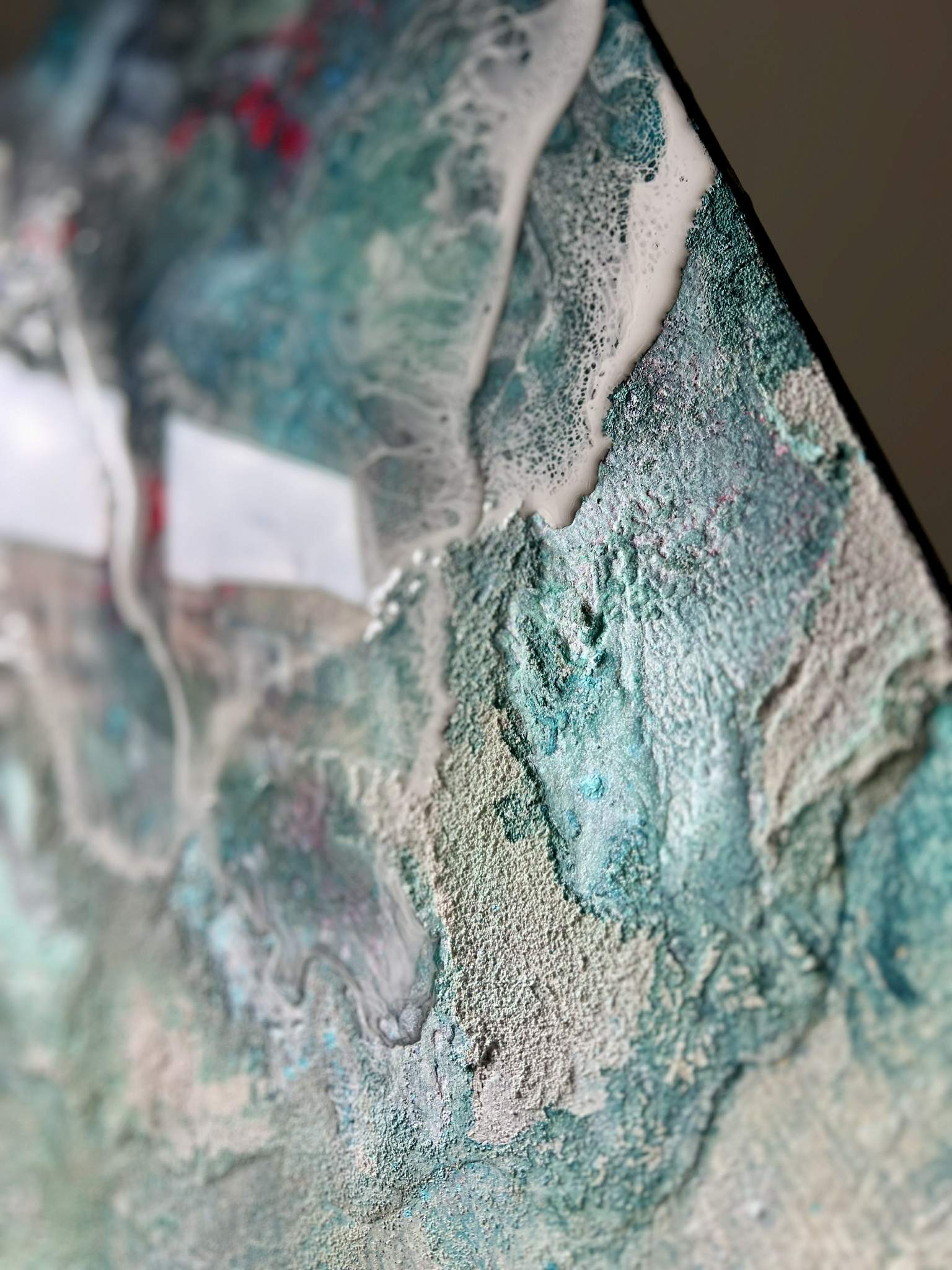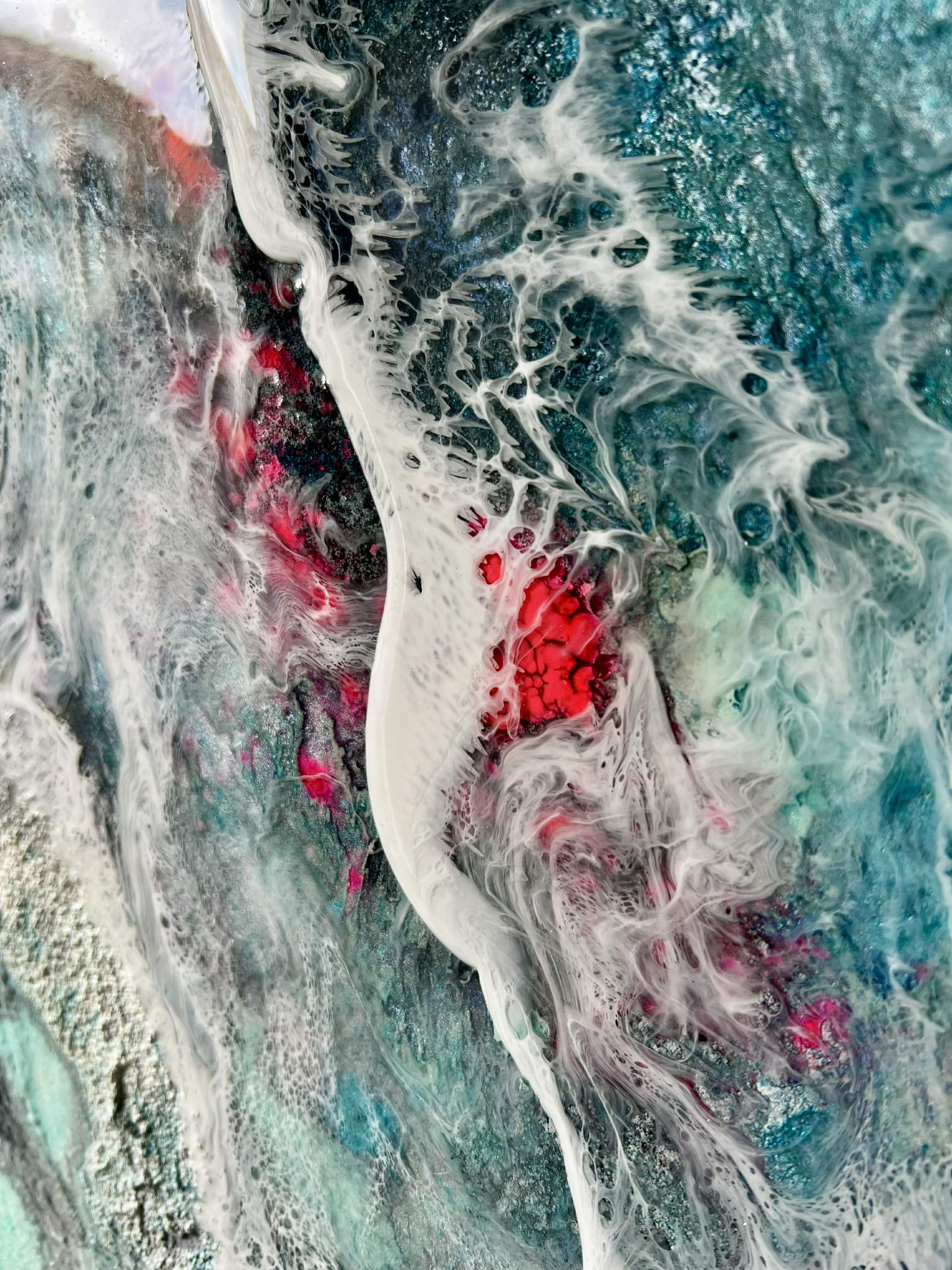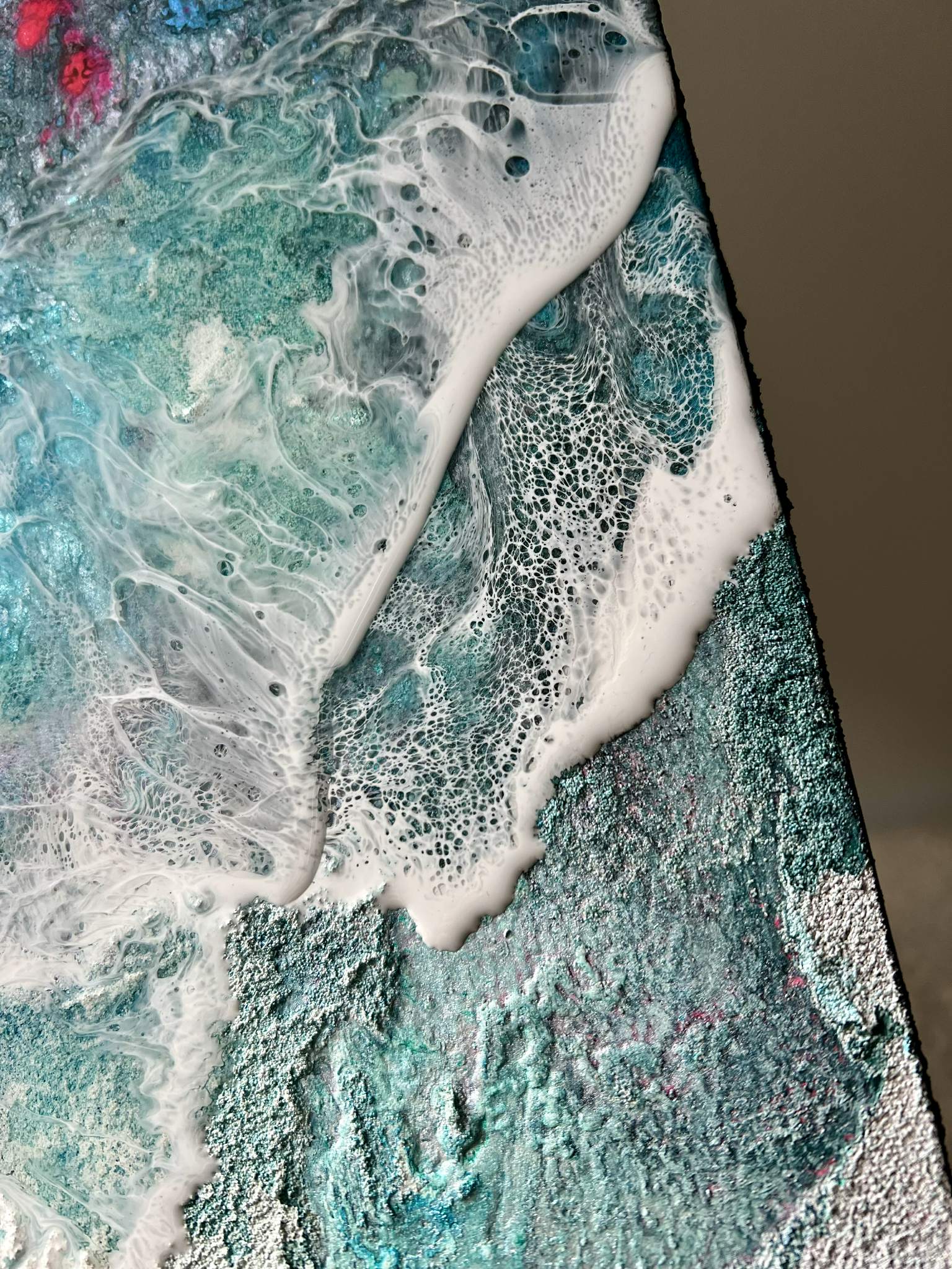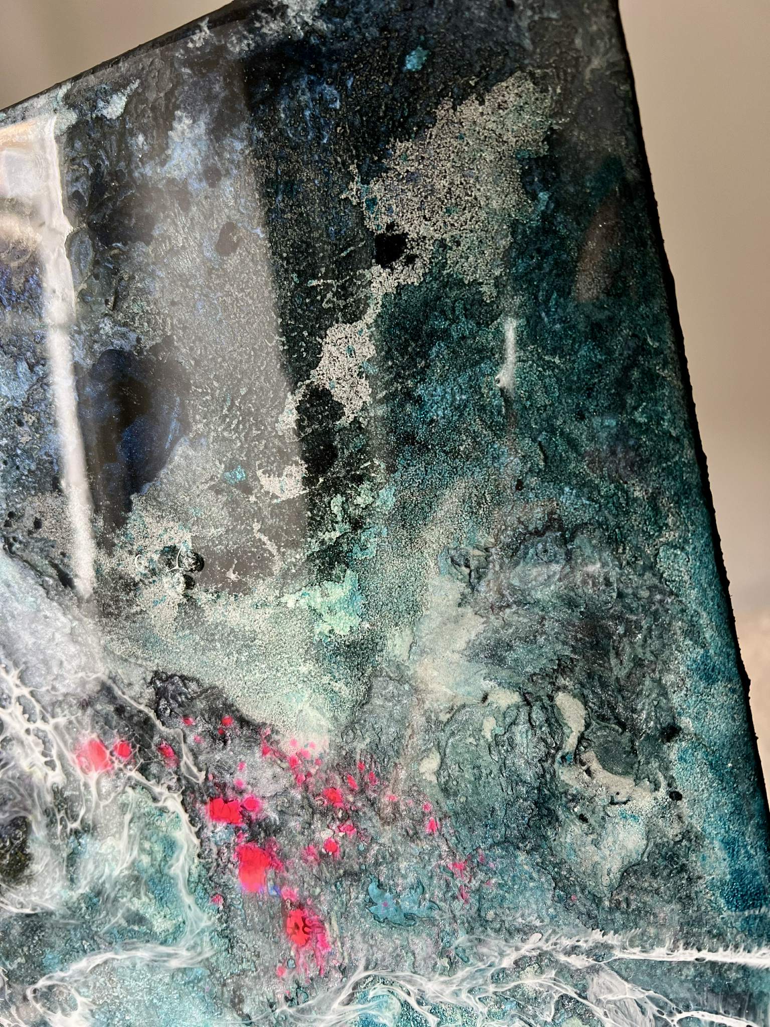 Ten wyjątkowy obraz to fuzja surowości struktury z głębią żywicy epoksydowej. Lodowe barwy, przełamane intensywną bielą i niespodziewanymi rozbłyskami różu, tworzą wrażenie energii – jakby w środku obrazu rozgrywał się podwodny spektakl. Powierzchnia jest zróżnicowana – miejscami matowa, miejscami lśniąca, co daje efekt trójwymiarowości i zmienia się w zależności od kąta padania światła.