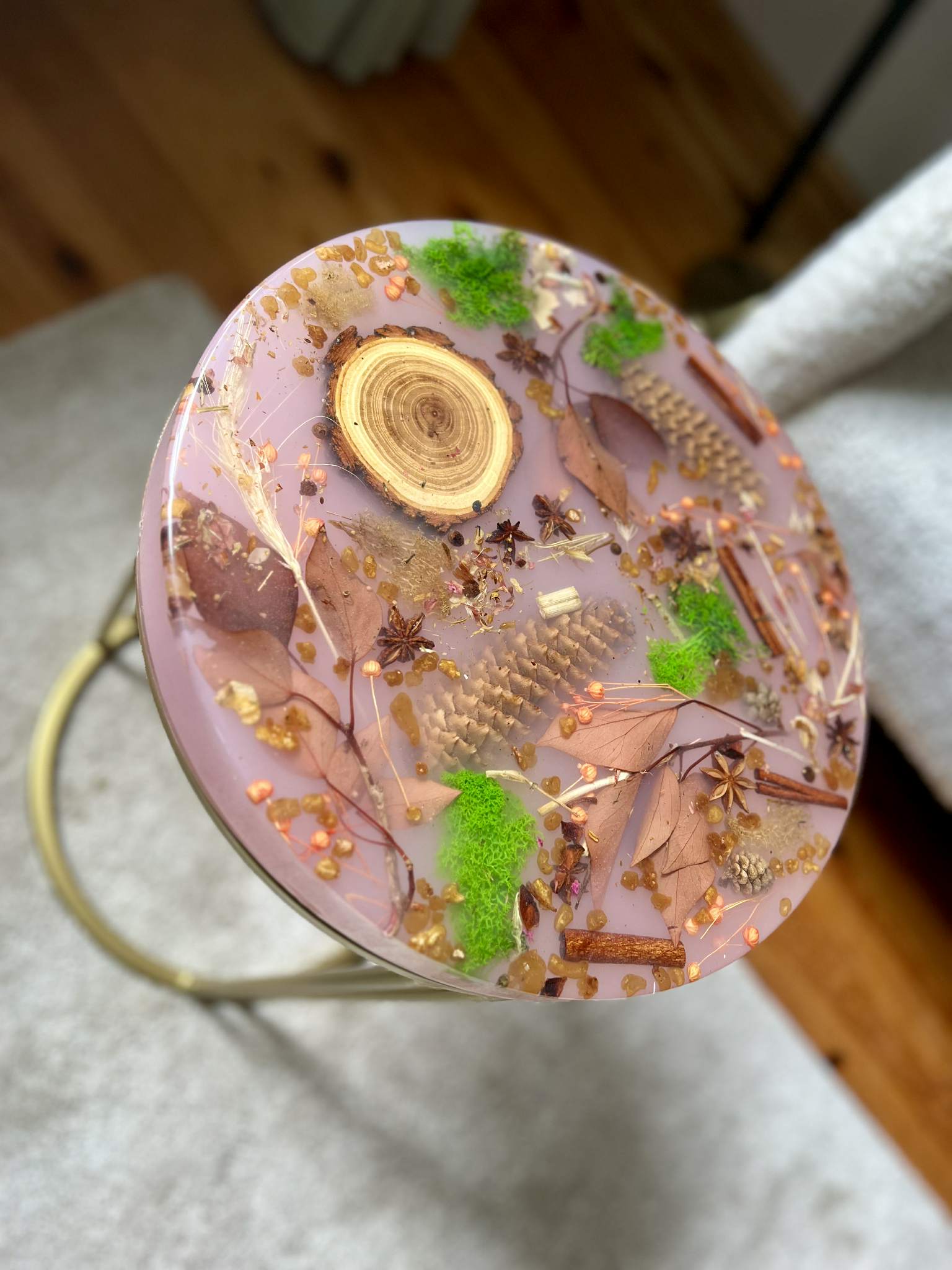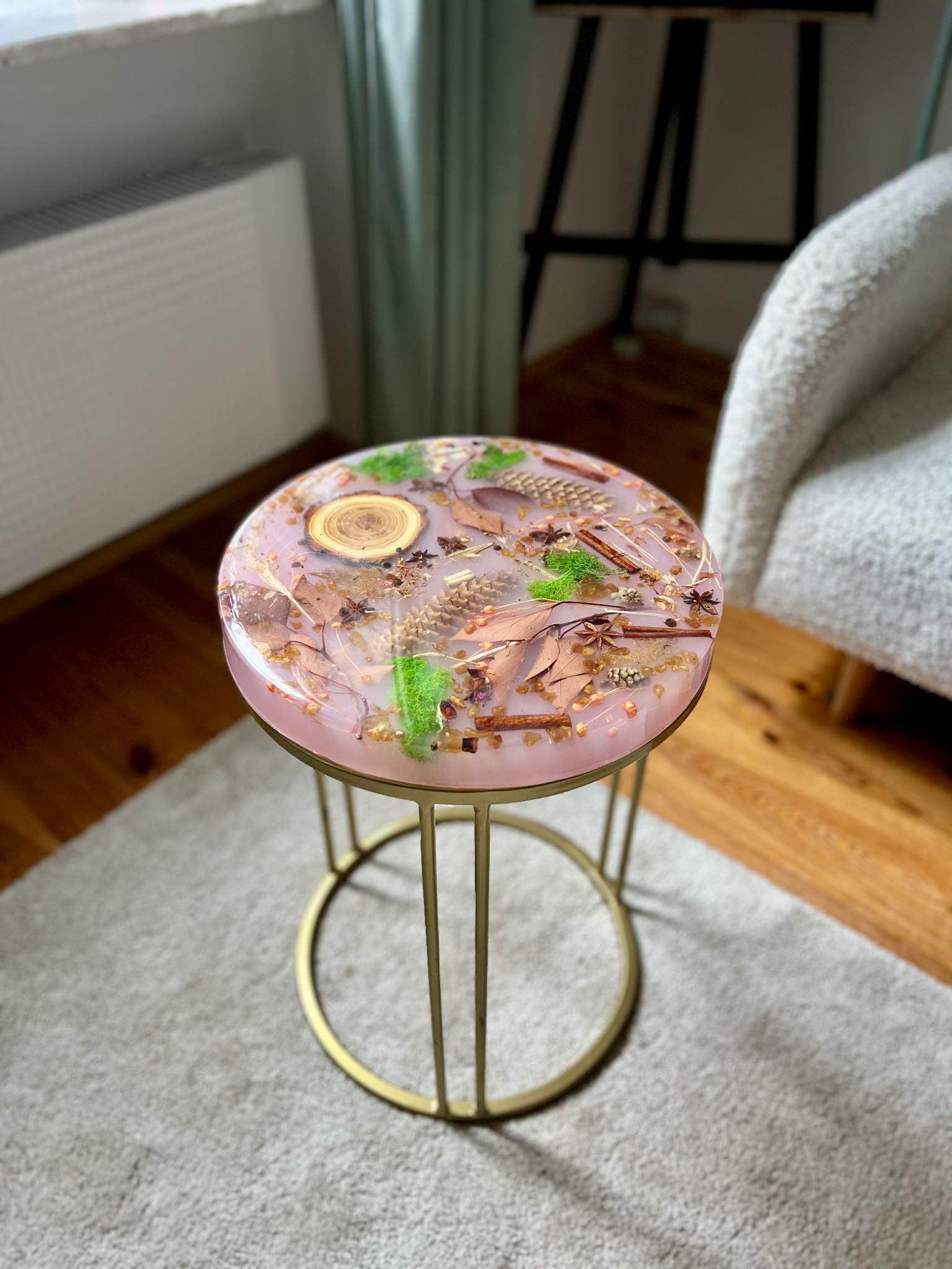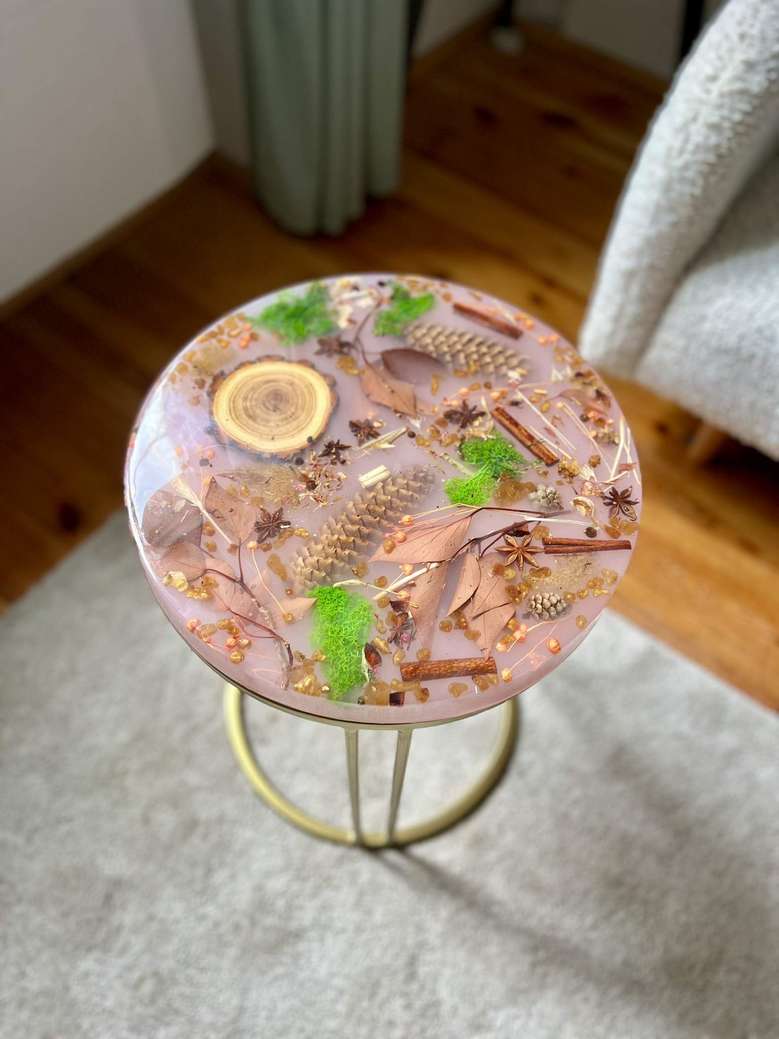 Ten stolik to jak zatrzymana w żywicy aromatyczna opowieść o lesie i naturze – znajdziesz tu gałązki, anyż, cynamon, mech, szyszki, fragment drewna i zioła, starannie zatopione w półtransparentnej żywicy o ciepłym, herbacianym odcieniu. Całość tworzy wrażenie lekkości, świeżości i… zapachu. To jak filiżanka leśnej herbaty, tylko że w formie mebla.