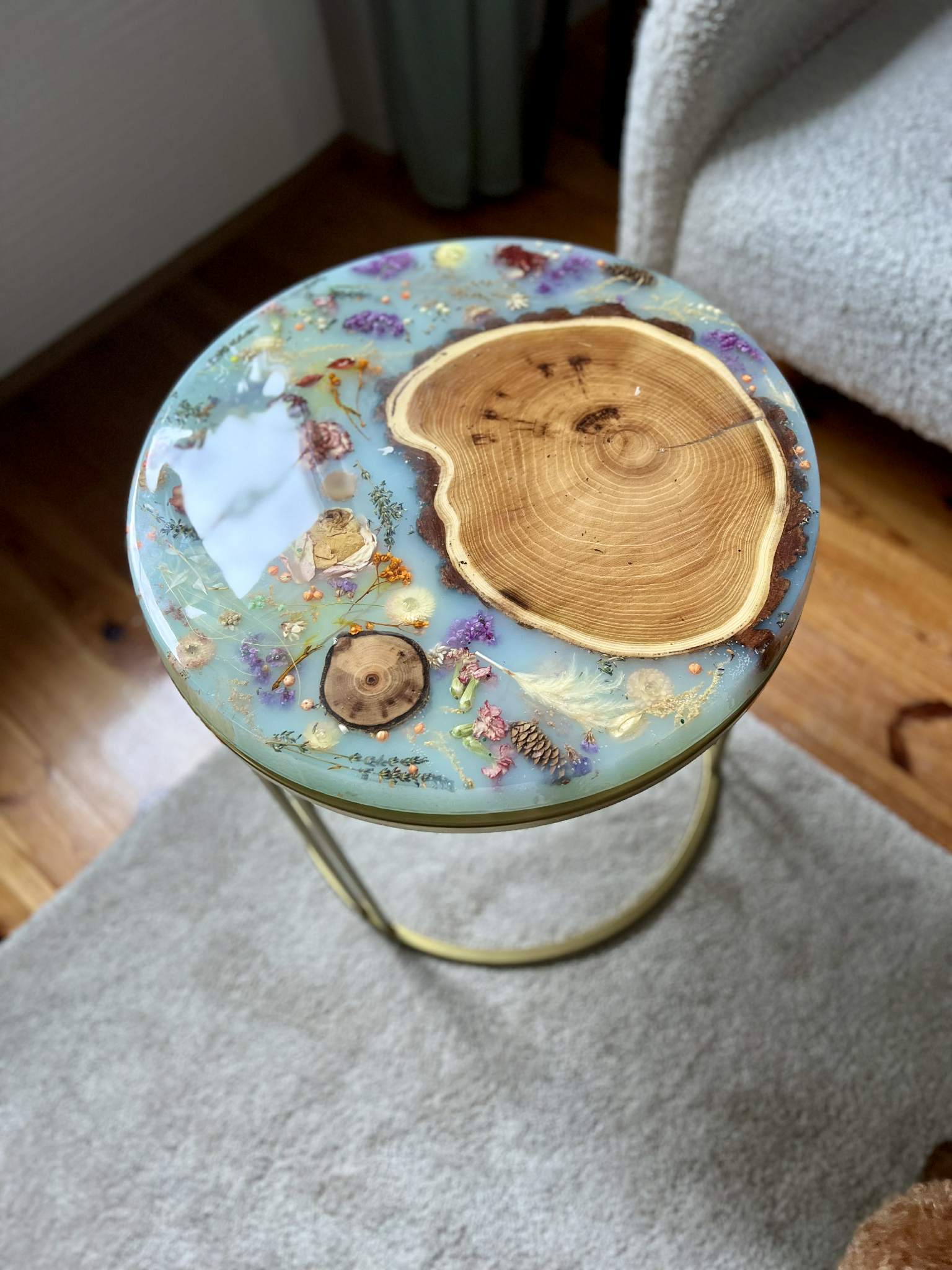 Każda z takich prac powstaje przez 2–3 tygodnie, w powolnym, ręcznym procesie tworzenia i utwardzania żywicy. Kwiaty i elementy przyrodnicze są suszone i układane przez moją mamę – z ogromną starannością, bez pośpiechu, z szacunkiem do natury.
